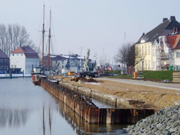- 155 m einfach verankerte, vorgerammte Stahlspundwand mit Stahlbetonholm als Gurtung;
