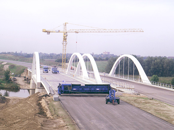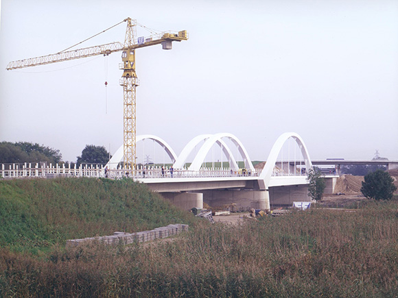 • Kanalbrücken: Stabbogen mit Verbundplatte, Stützweite 59 m