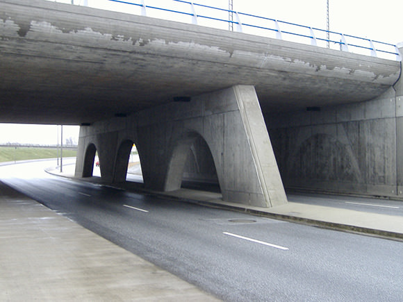 • je Fahrtrichtung 2 Fahrspuren a 3,50 m sowie ein einseitiger Geh- und Radweg von 3,20 m Breite und ein einseitiger Notgehweg von 0,65 m Breite;