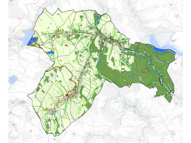 Im Zuge von mehreren städtebaulichen Problemstellungen und einem Dorfumbauplan beschloss die Verwaltung den F-Plan fortzuschreiben. Insbesondere waren Baustandorte für Wohnbeabuung in einem gesamtkommunalen Kontext zu betrachten. Hierfür stellten wir Szenarien der stätebaulichen Entwicklung auf, welche Bedarfe abzusehen sind. Die Gegenüberstellung der weiterhin schrumfenden Bevölkerungszahl mit den steigenden Wohnraumansprüchen waren wesentliche Faktoren. Vielfältige Abbildungen und eine übersichtliche Dokumentstruktur schufen eine transparente Unterlage mit der die verwaltungstechnischen Rahmenbedingungen leicht vermittelt werden können. Bauland konnte aufgrund von extrem niedrigen Vermarktungspreisen hauptsächlich nur straßenbegleitend ausgewiesen werden, da Entwicklungen im Außenbereich die Baukosten für die Erschließung nicht rechtfertigten.