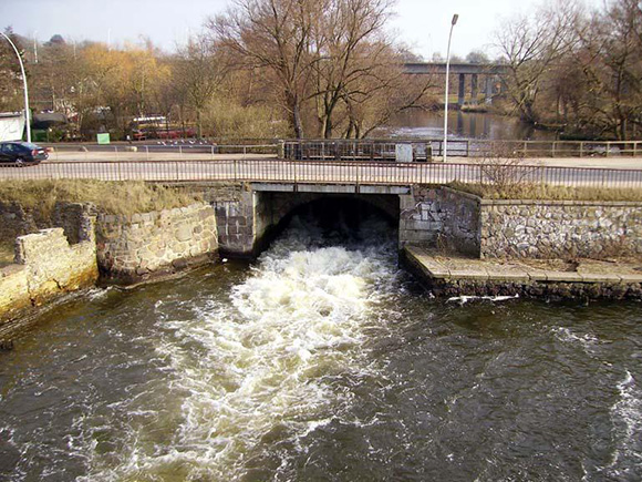 Stahlbetonfertigteil-Brücke (Pi-Platten), 5-Feld-Bauwerk an der Holsatiamühle aus dem Jahr 1981, Gründung um 1800, Gesamtstützweite 30,30m