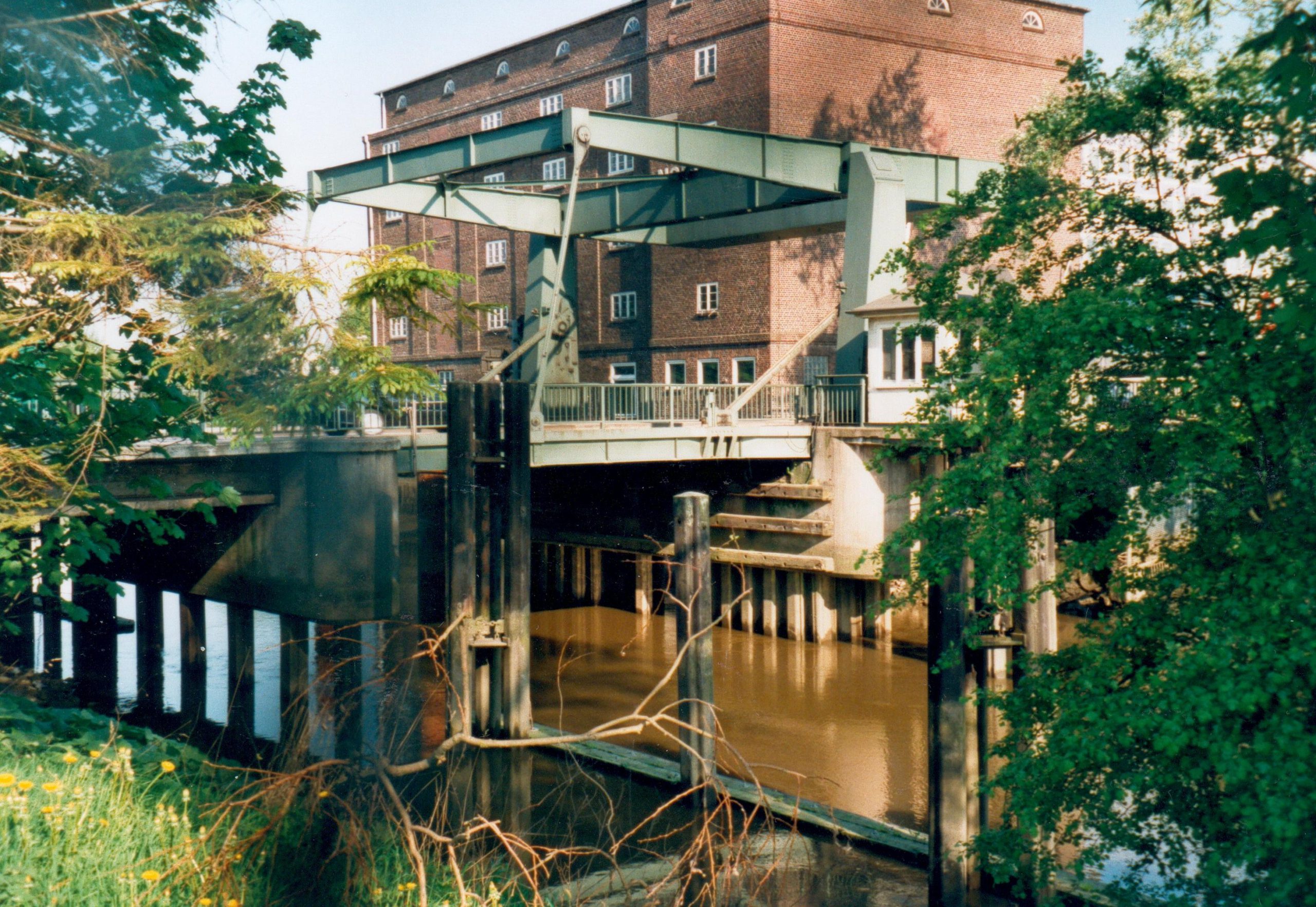 Einfeldrige Waagebalkenklappbrücke aus Stahl mit je 1 Vorlandbrücke aus Spannbeton;
