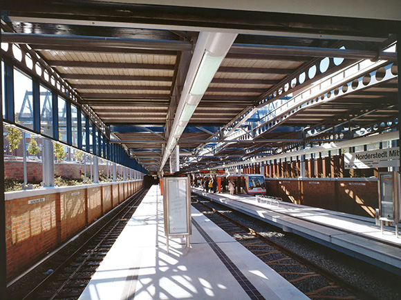 - Los 5: Tunnel und Trog Norderstedt-Mitte ca. 602 m lang. Die Herstellung der 2- bzw. 3-gleisigen Tunnel- und Trogblöcke erfolgte in offener Bauweise im Zentrum von Norderstedt. Aufgrund des hoch anstehenden Grundwassers wurden die Spundwände in den unter dem Sand anstehenden Mergel eingebunden. Um den quer zum Bauwerk verlaufenden Grundwasserstrom nicht zu stören, wurde die Baugrube in 4 Abschnitten hergestellt. Unterhalb der Tunnel- und Trogblöcke übernimmt eine Dükerschicht aus Filtersand im Endzustand diese Funktion.